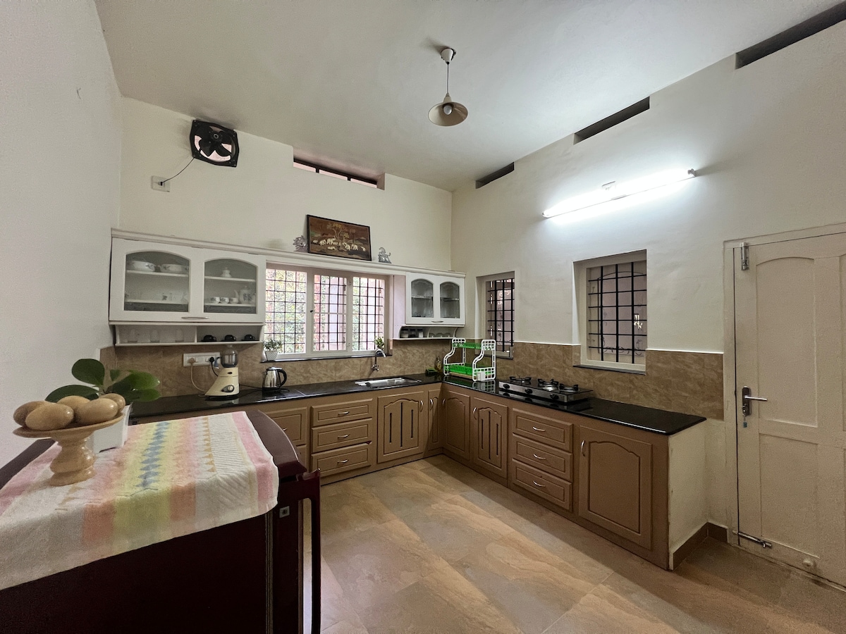 A apenas 1,8 km de Pala, perto de Mundupalam Junction, esta casa fica em uma pista tranquila. Tem 3 quartos com banheiros anexos e 2 quartos têm ar condicionado. Há 4 camas e é confortável para 6 hóspedes. Wi-Fi e backup de energia estão disponíveis. O estacionamento fica dentro do portão e funciona melhor para 1 carro, com espaço para vários veículos de duas rodas também. A cozinha está configurada para cozinhar levemente e os aplicativos de entrega de comida funcionam bem aqui. É um lugar calmo para uma estadia tranquila, então eventos e festas não são possíveis.
