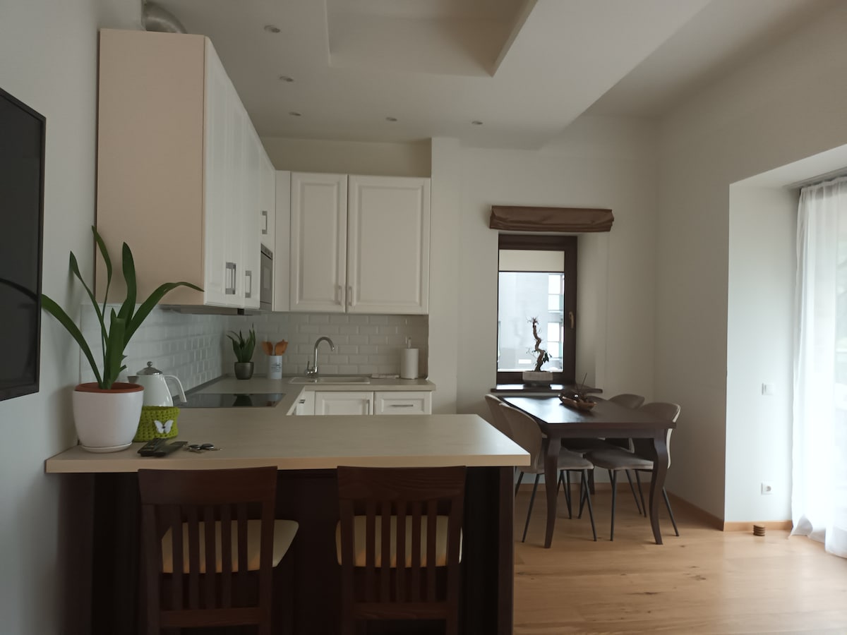 Bem no coração de Palanga confortável, espaçoso(42 m2.), Muito bem, apartamentos limpos e elegantes com uma varanda a poucos minutos a pé das principais atrações e atividades (praia - 10~15 min., Basanaviciaus str. - 5-10 min., mercado - 3 min., padaria, lojas, cafés, bancos - 1 min.). Estacionamento gratuito disponível. Nosso apartamento de 1 quarto é perfeito para uma família ou dois casais de amigos.
