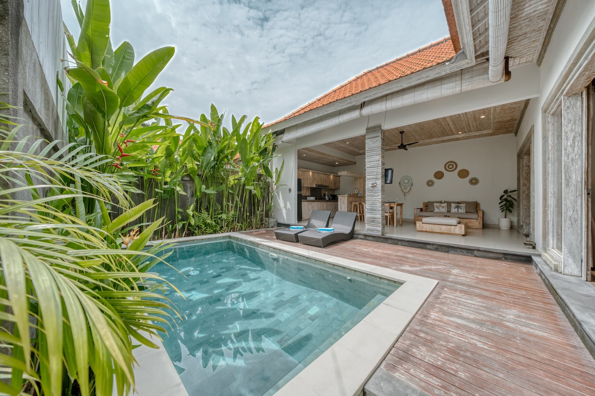 A vila está situada acima de 150 metros quadrados de terreno em um encantador complexo de vilas tropicais localizado entre Seminyak e Canggu, onde a praia ao pôr do sol com muitos cafés e clubes de praia encantadores fica a apenas 4 minutos a pé. A vila vem com serviço de limpeza diário, café da manhã, piscina privativa com cama de dia, grande área de estar, cozinha totalmente equipada, banheiro ao ar livre com banheira e chuveiro ao ar livre.