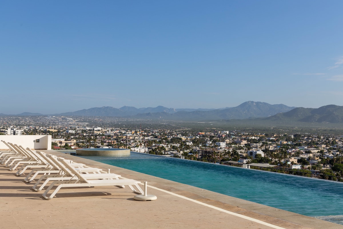 Confira nossas avaliações! Nova Cobertura Privada com piscina de entrada na bela, segura, privada, comunidade de Pedregal, na montanha no final do centro de Cabo San Lucas. Vistas incríveis a 5 minutos a pé da cidade, marina, praias, restaurantes, Waldorf Astoria, compras e passeios. Entrada principal sem chave. Precisa de outro quarto? Veja Air B N B. com/room/16557152 *Pode haver (máx. 2) outros hóspedes compartilhando a piscina até 22:00.