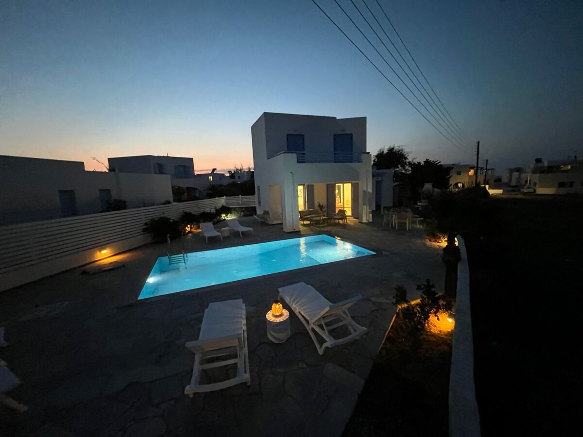 Bem-vindo à nossa casa na bela Santorini. Esta vila nova e confortável acomoda até 8 hóspedes e oferece tudo o que você precisa para uma estadia descontraída e agradável — perfeita para famílias ou um grupo de amigos que procuram relaxar em um ambiente tranquilo perto da praia.