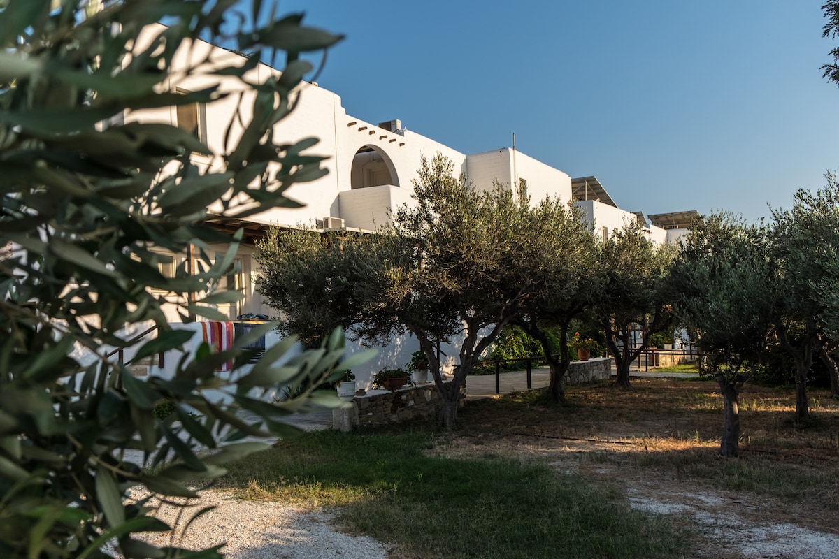 The studio is located in the center of Paroikia. It is ideal for couples and friends alike. The decoration is simple, with traditional touches. Outside there are stone tables and chairs to enjoy your breakfast. Still, the garden has olive trees that offer shade and relaxation. At 30 meters there is a super market. Within a 5-minute walk you will find yourself on the main beach of the island.