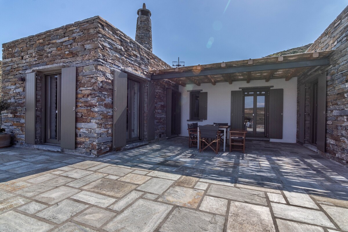 Uma casa de campo que, como se diria, é uma varanda no Egeu. Está localizado a 430 metros acima do mar e a 4 km da praia de Orkos e Ioulida. A paisagem com carvalhos oferece serenidade aos visitantes e é completada com um maravilhoso nascer do sol e o sol saindo pelo mar, iluminando as ilhas das Cíclades que se distinguem. Venha provar produtos tradicionais dos proprietários e desfrute de uma hospitalidade única de pessoas comuns.