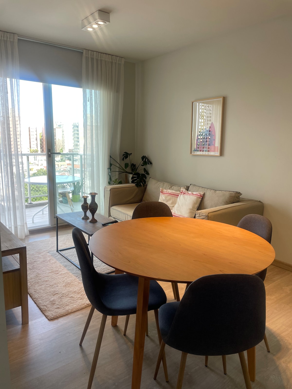 Silencioso departamento de una habitación. Luminoso, fresco y tranquilo. La habitación principal cuenta con una cama doble tamaño Queen y un placard amplio. Tiene una ventana que da hacia un palo borracho centenario. El living comedor tiene una mesa para seis personas, el televisor, y un sofá cama de dos plazas. Desde el living se accede a una terracita con una hermosa vista de la ciudad.