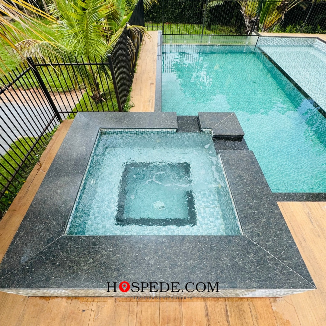 Confortável residência com piscina - 3 dormitórios com suíte - 1 quarto equipado com ar condicionado - Sala de jantar com mesa para 6 pessoas - Sala com sofá - Televisão de 42 polegadas - Conexão de internet - Cozinha equipada - Lavabo - Espaço para churrasco -Varanda com 10 Mesas e 38 cadeiras - Garagem com capacidade para até 10 carros - Sistema de cerca elétrica - Câmeras de segurança -Área Gourmet
