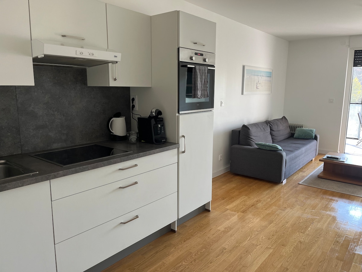 Em frente ao Parlamento Europeu, em uma nova residência de luxo no bairro de negócios Archipel, oferecemos um espaçoso apartamento de 2 quartos mobiliado e equipado com cuidado. Localizado no 7º andar, oferece, a partir do seu belo terraço de 10 m² virado para o sul, uma vista esplêndida de Estrasburgo. Estacionamento gratuito na entrada do prédio. Dois bondes e um ônibus levam você a qualquer lugar e muito rapidamente! (Mercado de Natal a 11 minutos, estação de trem a 15 minutos). Lojas ao pé do prédio.