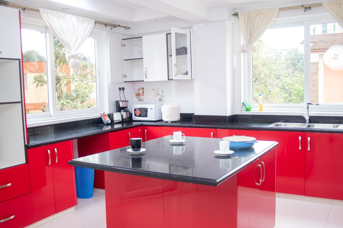 Este apartamento elegante inteiro é moderno, espaçoso e confortável, com um quarto e banheiro privativo, cama king size luxuosa, sala de jantar eloquente, quarto e lounge Netflix-TV, varanda, cozinha e área de máquina de lavar roupa. Todas as comodidades fornecidas, incluindo Wi-Fi rápido ilimitado e instalações comerciais. Situado em um subúrbio tranquilo e arborizado, mas também convenientemente perto de Westgate, shoppings de Sarit e Lavington, restaurantes, centros de negócios, CBD e a poucos metros a pé da vida noturna de Westlands.