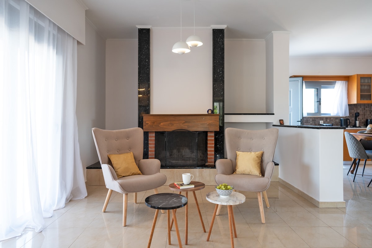 A Filerimos Panorama Villa é um refúgio moderno e elegante para até 7 hóspedes, situado na natureza perto de Pastida, Rodes. Desfrute de total privacidade, uma moderna piscina privada com espreguiçadeiras, jardim exuberante e vistas deslumbrantes da colina Filerimos. A vila oferece 3 quartos, 2 banheiros, uma cozinha totalmente equipada, lareira interna, churrasqueira, área de jantar ao ar livre, Wi-Fi e estacionamento privativo - perfeito para famílias ou amigos que procuram relaxamento com conforto e elegância.