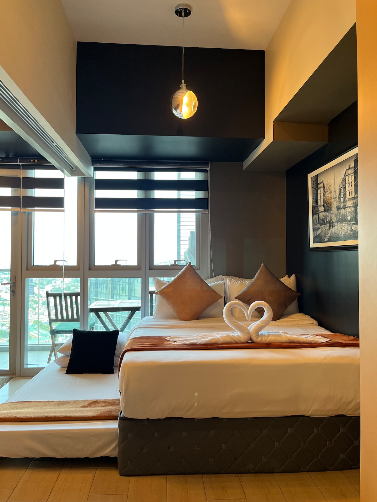 MÁXIMO 3 ADULTOS (11 ANOS OU MAIS). CRIANÇAS DE 10 ANOS OU MENOS ESTÃO ISENTAS DO LIMITE DE OCUPAÇÃO. Experimente uma vida de luxo nesta suíte contemporânea com uma cama adicional em estilo loft. Situada no coração de BGC, desfrute de uma vista deslumbrante das luzes do Uptown Mall através de janelas amplas. Luxo 5 estrelas com Wi-Fi rápido, comodidades ecológicas e a conveniência de piscina, academia e acesso ao playground. Explore pontos de acesso próximos, como Shangri-La, High Street, St. Luke's, e clubes de primeira linha, como The Island e Xylo.