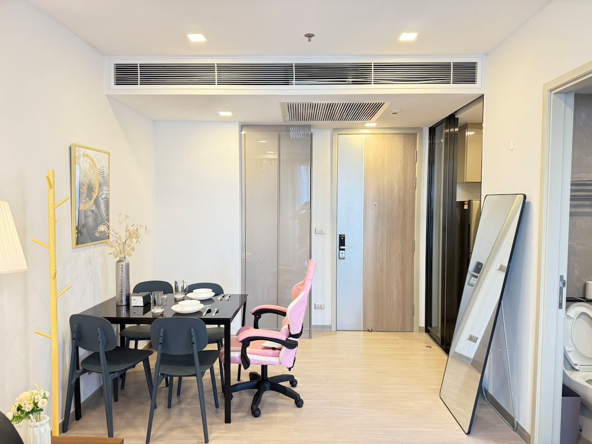 "Este novo apartamento de 1 quarto está localizado a apenas 7 minutos a pé atrás de Siam Paragon, uma das melhores localizações da cidade e a 350 m de BTS Ratchathewi" Seja o primeiro hóspede a desfrutar deste espaço imaculado, totalmente mobilado com design moderno e acabamentos de qualidade. - O Espaço 35 m² | 1 quarto | 1 banheiro Unidade nova — nunca morou Cama queen size, sofá-cama, smart TV, máquina de lavar e secar roupa Cozinha totalmente equipada: micro-ondas, geladeira, conjunto de jantar Reservas mensais são bem-vindas.