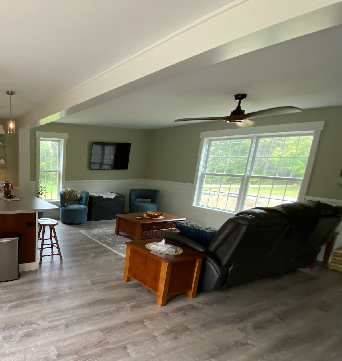 Ambiente rural tranquilo. Situado na floresta do Condado Norte, com estradas de terra para andar de bicicleta e caminhar. Proximidade de trilhas VAST & Biking. Casa recentemente reformada com 3 quartos e 2,5 banheiros. Cozinha espaçosa e nova com armários personalizados e bancadas de granito. Área de jantar, sala de estar caseira com várias janelas para observar a vida selvagem natural e os bosques circundantes. Cantos aconchegantes para leitura e uma estante cheia de livros, quebra-cabeças e jogos. Nova lavadora e secadora abastecidas com itens essenciais de lavanderia.