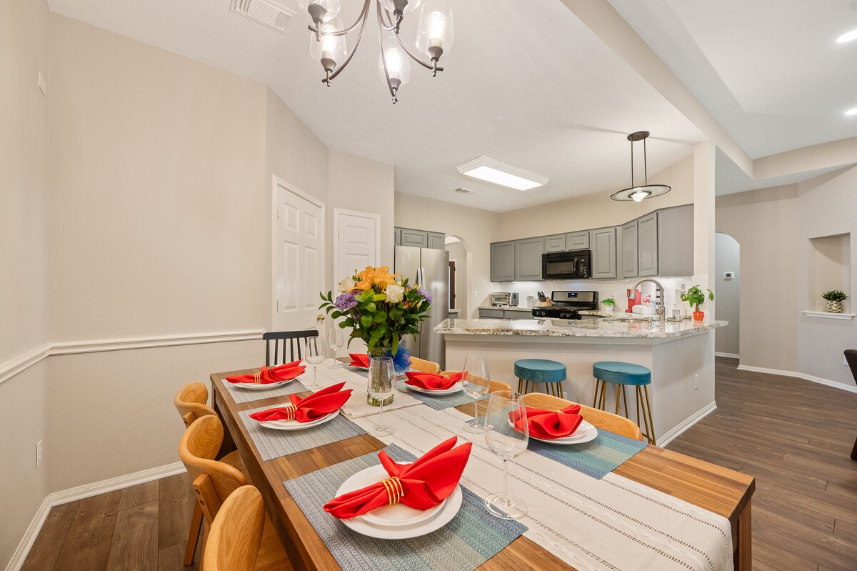 Come and enjoy this beautiful home with all new appliances and fixings! This property is a in a serene community just 28 minute drive from Houston's famous Medical Center and Downtown Area. Equipped with a fully stocked kitchen, including everything you need for a home cooked meal. This home is ideal for group getaways, work-from-home, weekend, weekly and even monthly stays. smart refrigerator, SmartTVs for everyone to enjoy and a separate home office.