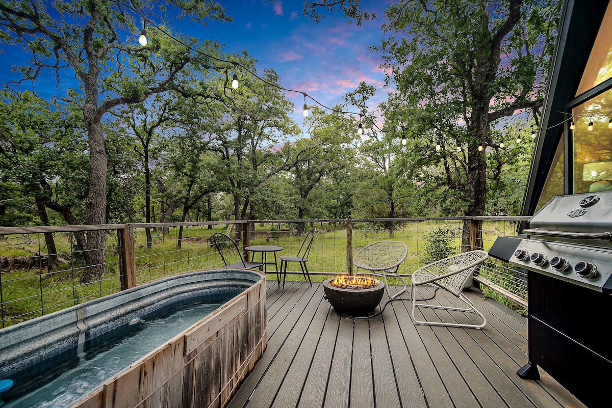 Hospede-se em uma cabana moderna em forma de A em 17 acres cênicos nos arredores de Fredericksburg. O Comal acomoda 2–4 pessoas com um quarto king, loft aberto e opção de sofá-cama. Relaxe no deck, grelhe o jantar ao ar livre, relaxe na piscina de tanque de estoque privada (com aquecedor opcional) ou reúna-se ao redor da fogueira de propano sob o céu estrelado. A menos de 10 minutos da Main Street, este é o refúgio perfeito em Hill Country.