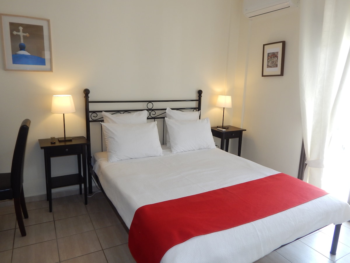 O apartamento confortável de 2 quartos, no piso térreo (5 pessoas), a 200 metros de uma praia de areia fina, muito bem localizado, com vista para o Golfo, rodeado por árvores frutíferas e pinheiros. Com 2 A/C e redes mosquiteiras, temos uma cozinha totalmente equipada (cozinha com fogão, máquina de lavar louça, micro-ondas, cafeteira, torradeira, chaleira e máquina de lavar e secar). Parque infantil para os nossos pequenos hóspedes! Com uma área de estacionamento privativo WIFI GRATUITO (também pode se conectar com cabo ethernet) Apenas 90 km do aeroporto de Tessalônica.