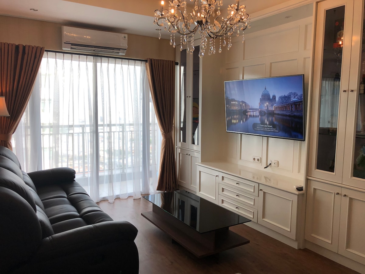 Fique em um apartamento elegante, compacto e aconchegante de 1 quarto, no coração de Pantai Indah Kapuk (PIK), Jacarta. Perfeito para trabalho ou lazer para 2 ou 3 pessoas, este apartamento oferece tudo o que você precisa para uma estadia aconchegante. Relaxe na cama queen size com lençóis macios ou relaxe no sofá-cama, ideal para hóspedes extras. - A cozinha totalmente equipada inclui um frigobar, panela de arroz e itens básicos de cozinha, perfeitos para preparar refeições simples. Wi-Fi, TV inteligente, toalhas limpas e produtos de higiene pessoal