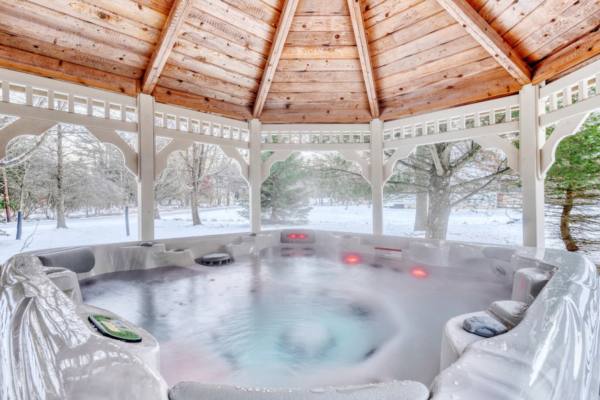 Imagine isso: café da manhã em um deck enorme enquanto os cervos passam, noites mergulhando em sua banheira de hidromassagem privada durante todo o ano sob as estrelas e noites aconchegadas perto da lareira em uma casa que os hóspedes chamam de "excepcionalmente limpa e incrivelmente aconchegante". Situado em uma comunidade tranquila e privada de lago e perto das principais atrações de Pocono, o Winnie's Retreat é o seu refúgio tranquilo sem abrir mão do conforto ou da conveniência — perfeito para escapadas românticas, aniversários e fins de semana inesquecíveis.