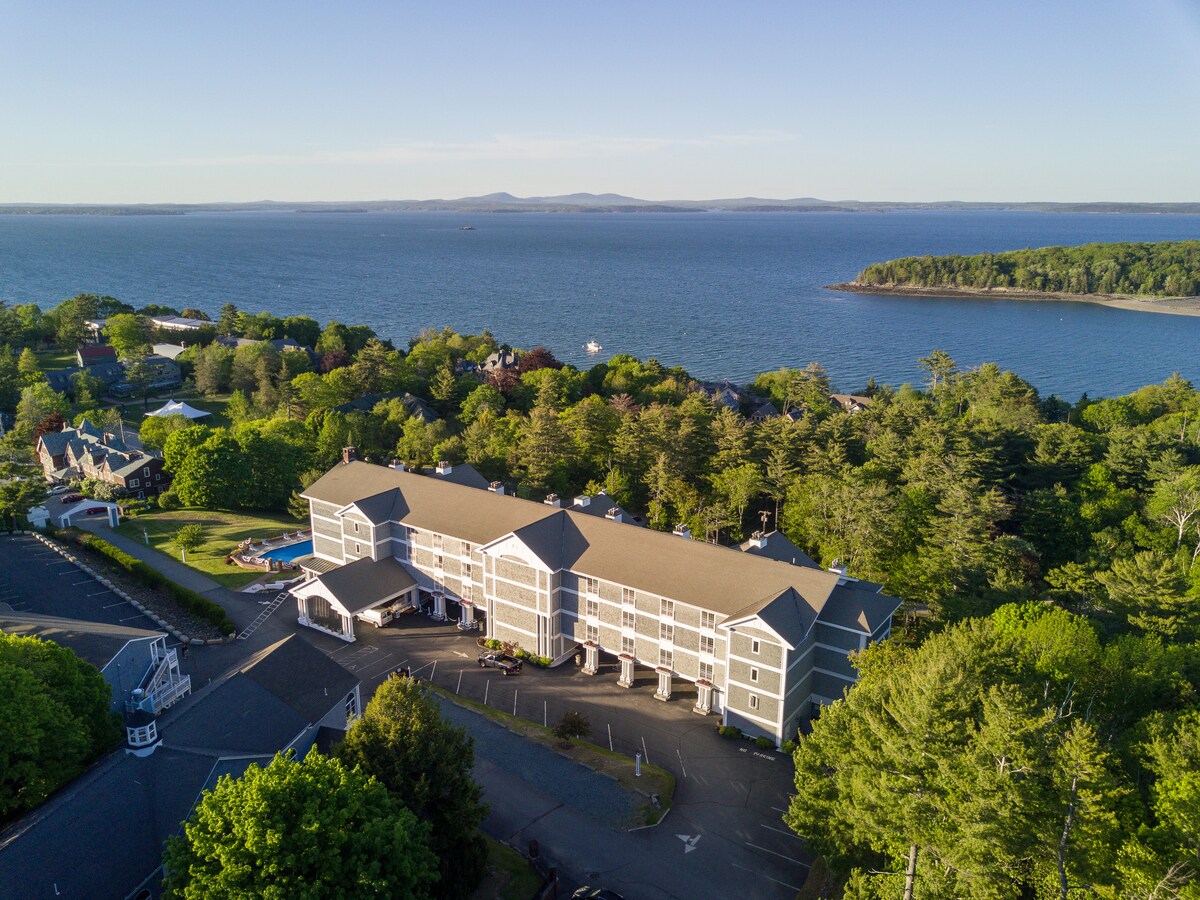 This is a 1st floor standard hotel room with a king bed in the Bluenose Inn. This room offers a large picture window but does not have a bay view. Guests have access to an outdoor pool, indoor pool, hot tub, steam room, fitness center, firepits, lawn games, business center, 24 hour coffee and tea, gift shop, on site breakfast restaurant, and Great Room Piano Lounge. The Bluenose Inn is located approximately 1 mile from Downtown Bar Harbor and 2 miles from Acadia National Park Visitor's Center.