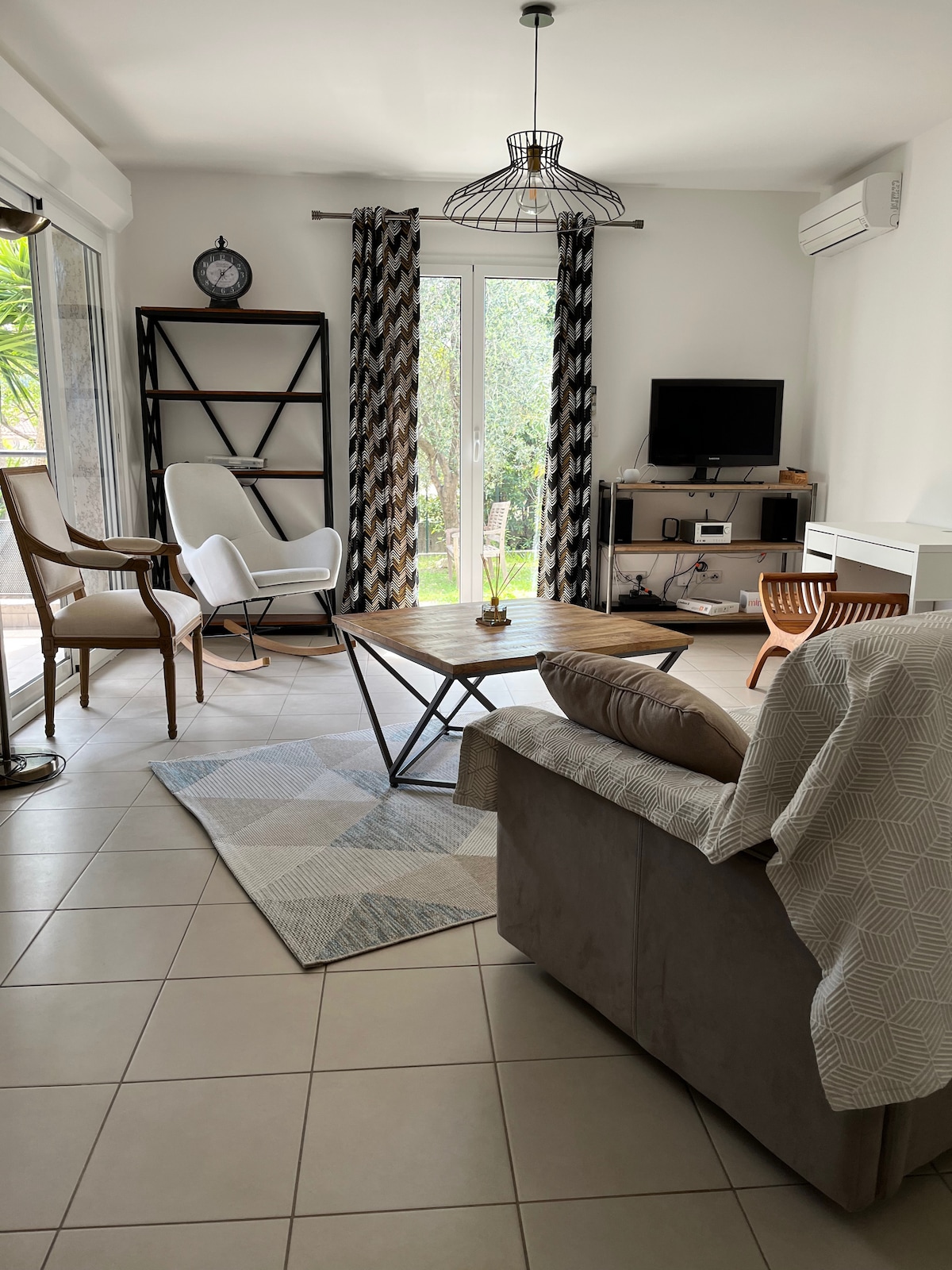 Bem-vindo ao nosso novo chalé com ar condicionado, situado no coração de um jardim privado cercado por loendros. Desfrute de um espaço moderno a 3 minutos de carro da praia e de todas as comodidades: alimentos, farmácia, restaurantes. À sua disposição, a cozinha equipada com fogão, micro-ondas, geladeira, máquina de lavar roupa, máquina de café expresso, chaleira. TV de tela grande, banheiro de luxo com chuveiro 90X120, secador de cabelo, jogos, espreguiçadeiras, mesa e cadeiras ao ar livre.