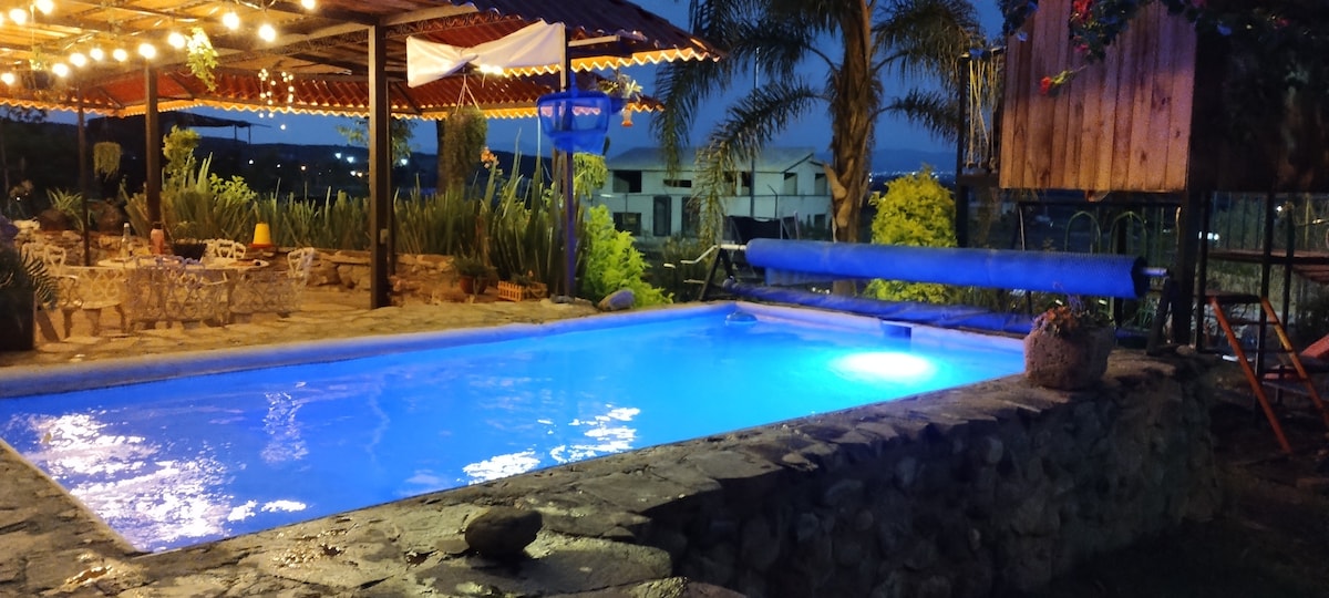 Relaxe e desfrute da tranquilidade, segurança e harmonia, uma mistura de natureza e antiguidade, parque infantil, casa de madeira, piscina aquecida individual (3 metros de largura x 5 metros de comprimento, 3 profundidades 50 cm, 100 cm e 160 cm). A casita é pequena de 3 níveis de 10x4mt cada, é semi rústica, tem todas as comodidades básicas, azador e terraço perto da piscina. 1 banheiro completo no térreo. 1 banheiro completo em frente à piscina. 2 media baños Simples, mas adequado para diversão