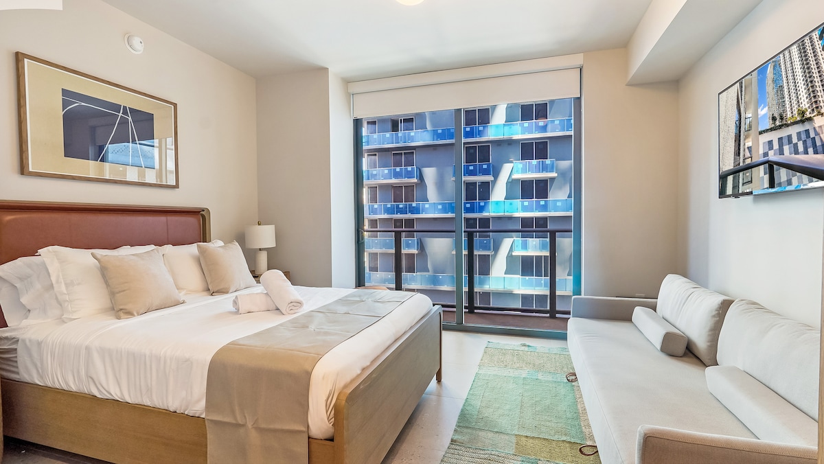 Modern Miami Studio with stunning views! Enjoy a cozy space with a King Size Bed, Smart TV, fast WiFi, and a private balcony. Perfect for relaxing after exploring the beach, nightlife, and top dining spots nearby. Located across the street from Bayside Marketplace Waterfront. Includes a kitchenette, central AC, and secure building access. Ideal for solo travelers or couples seeking comfort and style in the heart of Miami. Book your escape today 🌴