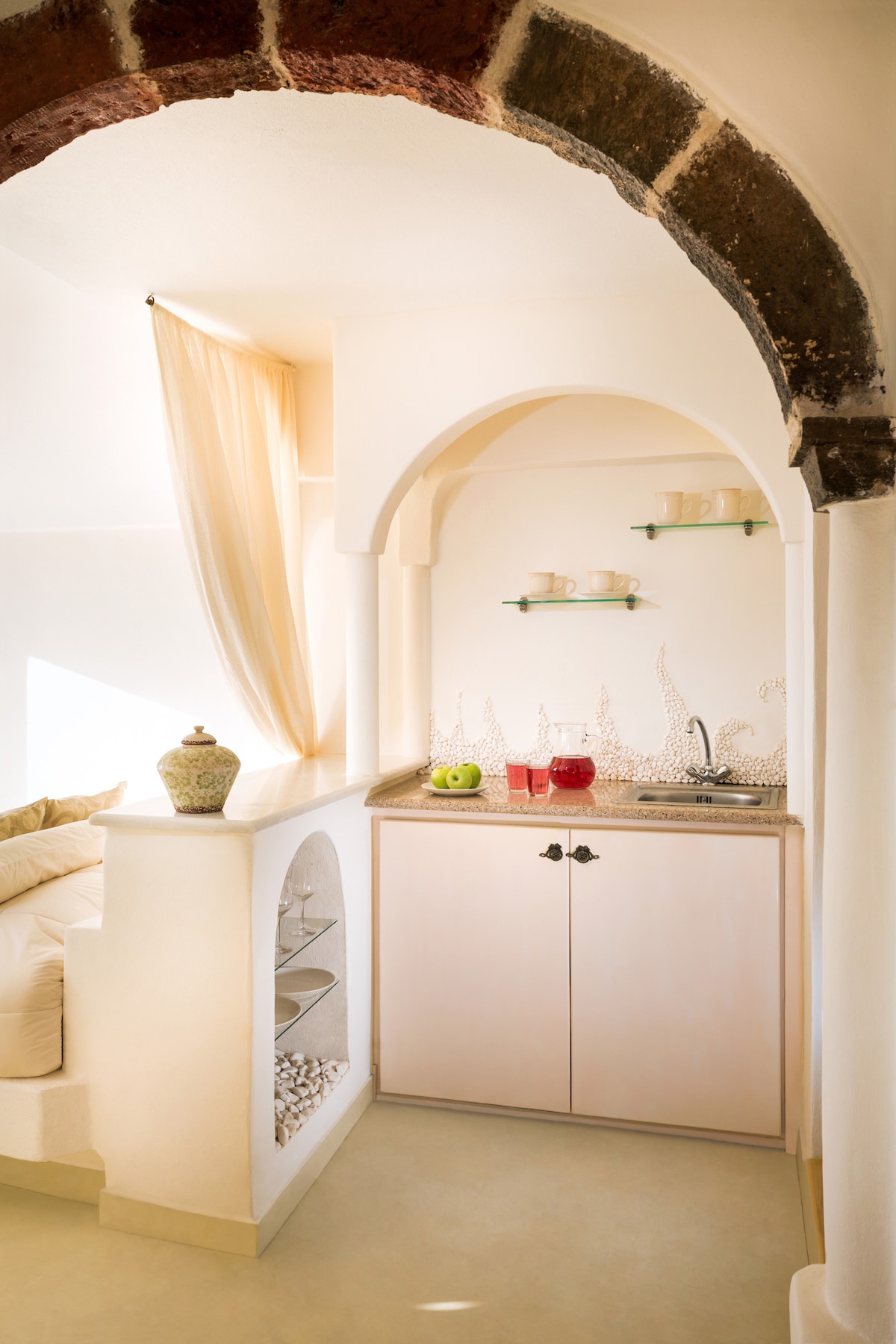 Situado em Magical Imerovigli, aninhado entre ambientes tradicionais caiados de branco nos penhascos de frente para Skaros, a 400 metros do nível do mar, oferecendo vistas panorâmicas e ininterruptas da ilha vulcânica que é Megali Kameni, a mundialmente famosa Caldera e, claro, as águas azuis profundas do mar Egeu, um cenário que você vai lembrar por muitos anos... (por favor, esteja ciente de que o hotel está localizado na caldeira, então pode haver degraus para chegar ao seu quarto e ao redor)
