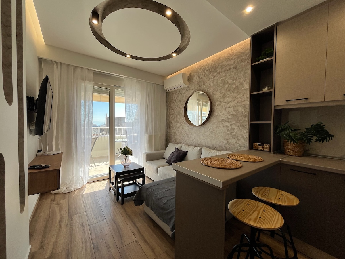Um apartamento bonito, espaçoso e leve no terraço com vista para o mar e a montanha. A 3 minutos de uma praia de estrelas azuis e de um hotel de 5 estrelas. Tem móveis de descida, louça, WIFI rápido, canais de TV de todo o mundo, sistema HIFI, ar condicionado, aquecimento a gás, estacionamento privativo, três varandas, elevador, interfone e um grande closet. Perto de Gerovassiliou (casa de vinhos), aeroporto (15min), barco para o centro da cidade no verão (45min). Por uma pequena taxa, podemos buscá-lo no aeroporto.
