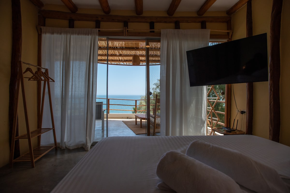 Beach front in Pocitas, Máncora, Peru. Nu House offers an exclusive space in the middle of nature. With direct access to the beach. Maximum capacity 6 people. The house has a main room with a king bed, bathroom and private terrace. The second and third bedrooms also have a king bed. You can request to replace the king bed with two 1.5-seater beds in the 2nd and 3rd rooms. Full kitchen, living room, dining room, terrace with pool and bar. Campfire area