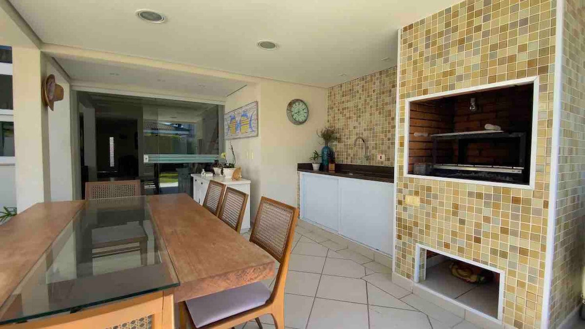 Leve toda a família a este ótimo lugar com muito espaço para se divertir. Casa super agradável, possui 4 suítes, piscina aquecida, ar condicionado em todos os ambientes(quartos e sala), dentro de um condominio fechado em frente a praia, super seguro, com quadra de tennis, quadra de futebol, academia, playground infantil, recreação e serviço de praia. A casa fica no início da segunda rua do condomínio, cerca de 80 metros da praia.
