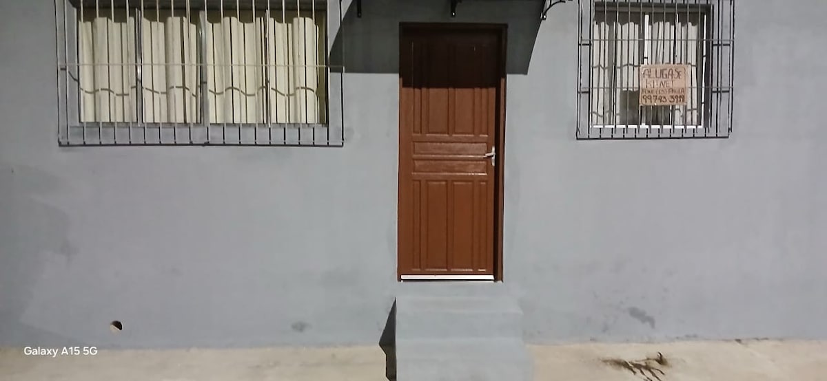A casa conta com, sala e quarto integrados, banheiro, cozinha americana com todos os utensílios para preparo de refeições ou um churrasco, na área externa temos uma churrasqueira, pia e mesa de quatro cadeiras, uma piscina pequena (1 metro de profundidade), garagem fechada grande( 30m²) porem só cabe um carro devido a lavanderia no mesmo espaço, e jardim com plantas e arvores frutíferas, tenho um aquário e um viveiro no quintal que cuido todos os dias pela manhã.