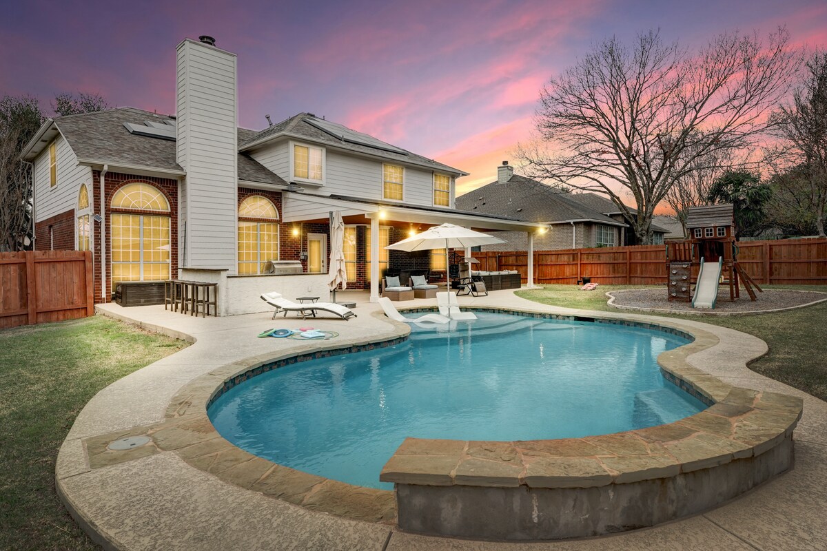 Esta casa deslumbrante oferece a mistura perfeita de conforto, estilo, diversão e funcionalidade para a vida moderna. Se você está desfrutando de tempo em família ou trabalhando remotamente, esta propriedade tem tudo o que você precisa. Com quartos projetados para relaxamento e um quintal em estilo resort, você e seu grupo estarão prontos para mergulhar em sua piscina privativa e aproveitar o sol do Texas. Um trampolim, um parque infantil e uma mini piscina/pebolim/mesa de hóquei 3 em 1 oferecem diversão sem fim para crianças e reuniões familiares.