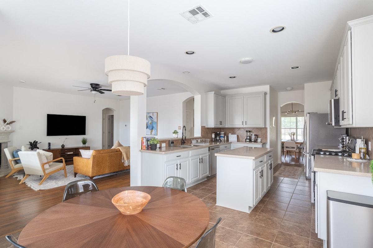 Assista a um jogo no Express Dell Diamond ou mergulhe no Kalahari Resorts Waterpark, localizado a 1 minuto de distância desta elegante casa de Round Rock. Crie refeições gourmet na bela cozinha que possui uma grande ilha de granito. Desfrute de um piquenique e fogos de artifício (durante a temporada de beisebol e 4 de julho) na área do pátio com uma grelha perfeita para um churrasco do Texas. Casa inteira (aprox. 1588 pés quadrados) com 3 quartos, 2 banheiros, 1 sala de estar, 1 sala de jantar e uma bela cozinha espaçosa + sala de jogos na garagem. Desfrute do quintal equipado com uma churrasqueira e mesa de piquenique ao ar livre. Você tem acesso à casa inteira, incluindo a garagem (sala de jogos convertida). Você também tem acesso ao quintal e à frente. Acesso ao imóvel - entrada sem chave. Fique à vontade para ligar/enviar mensagens caso tenha alguma dúvida. A casa fica em frente ao Dell Diamond, ao Kalahari Resort Waterpark e a várias mercearias. Dê uma corrida em uma das trilhas de corrida próximas no Old Settlers Park. O Lago Travis e a cidade de Austin ficam a uma curta distância de carro. Magnolia Market, Magnolia Table e Press Coffee Co (empresas Chip e Joanna Gains) estão a apenas uma hora de distância. De carro. Por favor, estacione na garagem. Por favor, não estacione na calçada. Manual da casa disponível na mesa da entrada para ajudá-lo a navegar pela casa :)