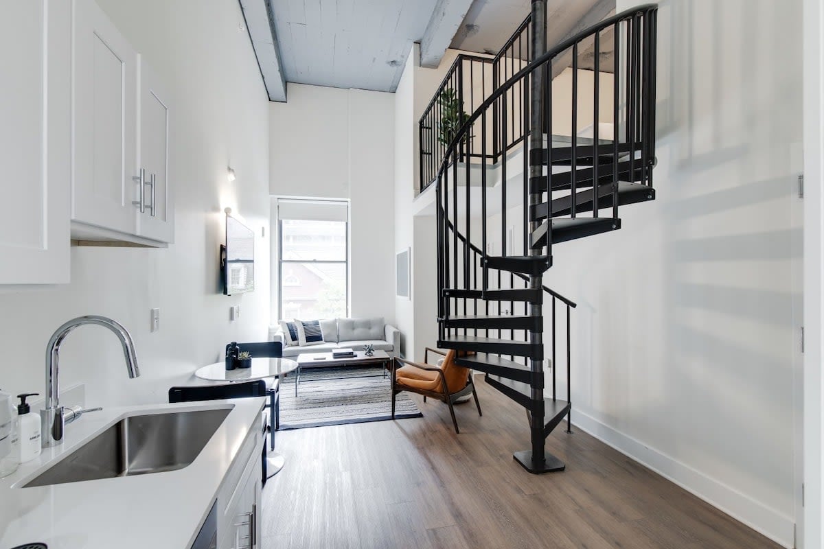 2 Bedroom Loft, 1 Bath 2 Queen Beds Whether you’re in Philly for history, business, or a weekend escape, this loft-style two-bedroom makes it easy to settle in. You’ll have a full kitchen, in-unit washer/dryer, and a simple, comfortable setup—plus access to standout building amenities like a gym, coworking space, and community lounge—right in Old City near Independence Mall. Note: This apartment is in a lively downtown area, and some city noise should be expected. This is a loft-style layout a
