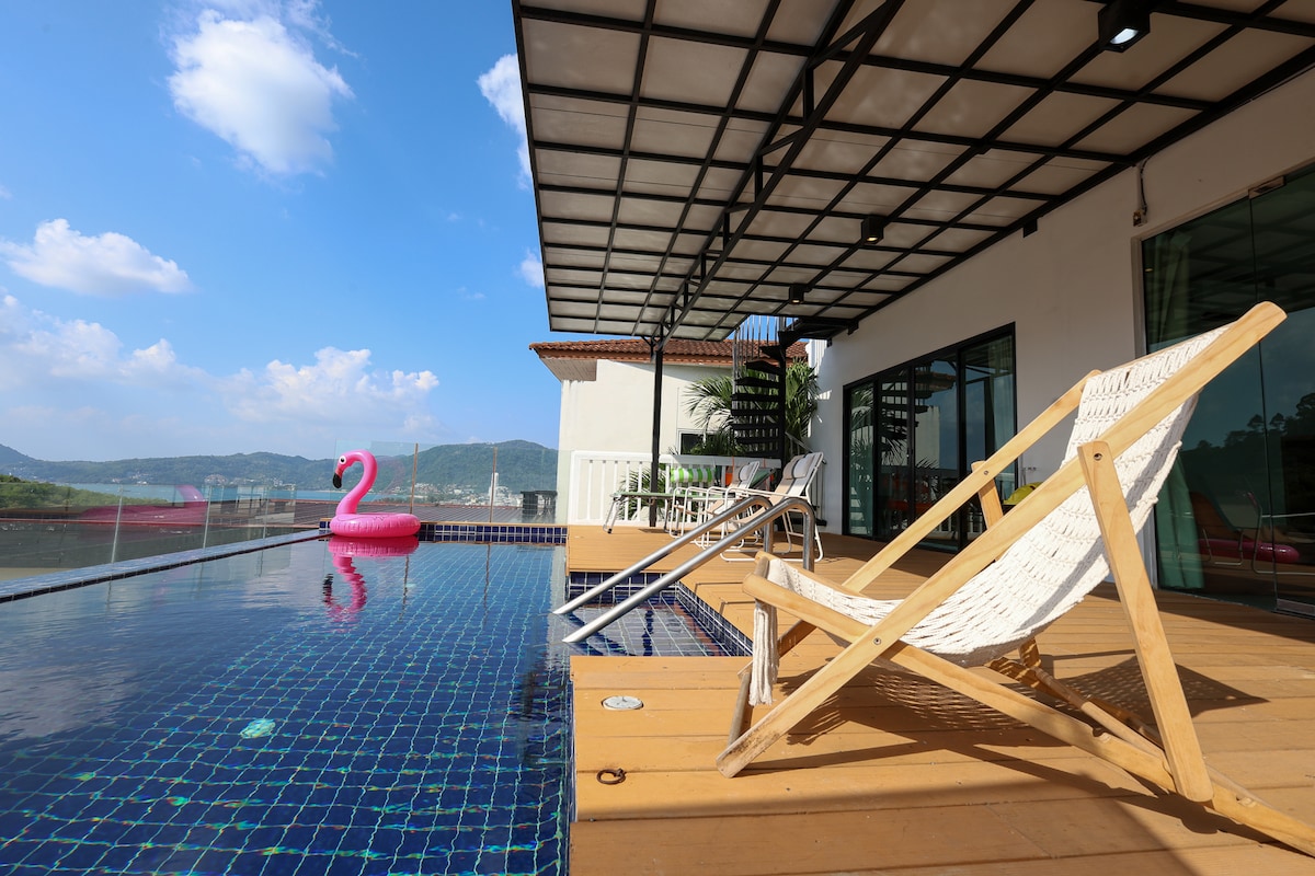 Durante a construção, o designer da vila aproveitou habilmente a topografia das colinas locais para construir, o que significa que você pode ter uma vista panorâmica de toda a baía de Pudong na sala de estar, na piscina e no quarto. Abrace seu amor ao lado da piscina, ouça músicas românticas, saboreie vinhos e aprecie o pôr do sol e a vista noturna do porto. Ou relaxe com um livro e um café, sinta a brisa e ouça a voz da natureza. Apenas 5 minutos da vila até a praia de Patong e o centro comercial, Mercado de frutos do mar de Bang Rai. Para o acampamento de elefantes marinhos e o acampamento de travessia da selva, o Parque Florestal Nacional fica a apenas 8 minutos. 2 quartos, cada um com um banheiro privativo e um banheiro, equipados com uma cama king size, localizados no mesmo andar. A cozinha americana está totalmente equipada com eletrodomésticos europeus. Há uma sala de jantar para 6 pessoas conectada à sala de estar. A sala de estar leva diretamente ao terraço panorâmico ao ar livre e à piscina privada, proporcionando outro local ideal para apreciar a vista do mar. Você também pode pegar o elevador diretamente para o terraço no último andar para desfrutar do sol e da bela paisagem. Nossa vila tem uma árvore alta, que cresce naturalmente e tem uma forma única. É muito majestoso, permitindo que você sinta a grandeza e a magia da natureza. A vila oferece lugares de estacionamento para você estacionar seu carro ou moto. A 500 metros da vila, há um restaurante que serve comida ocidental, pizza e comida tailandesa, que são muito saborosas. O restaurante oferece serviço de entrega durante o horário de funcionamento. Há também um café e um bar ao lado e uma loja de conveniência a 200 metros para atender às necessidades diárias.