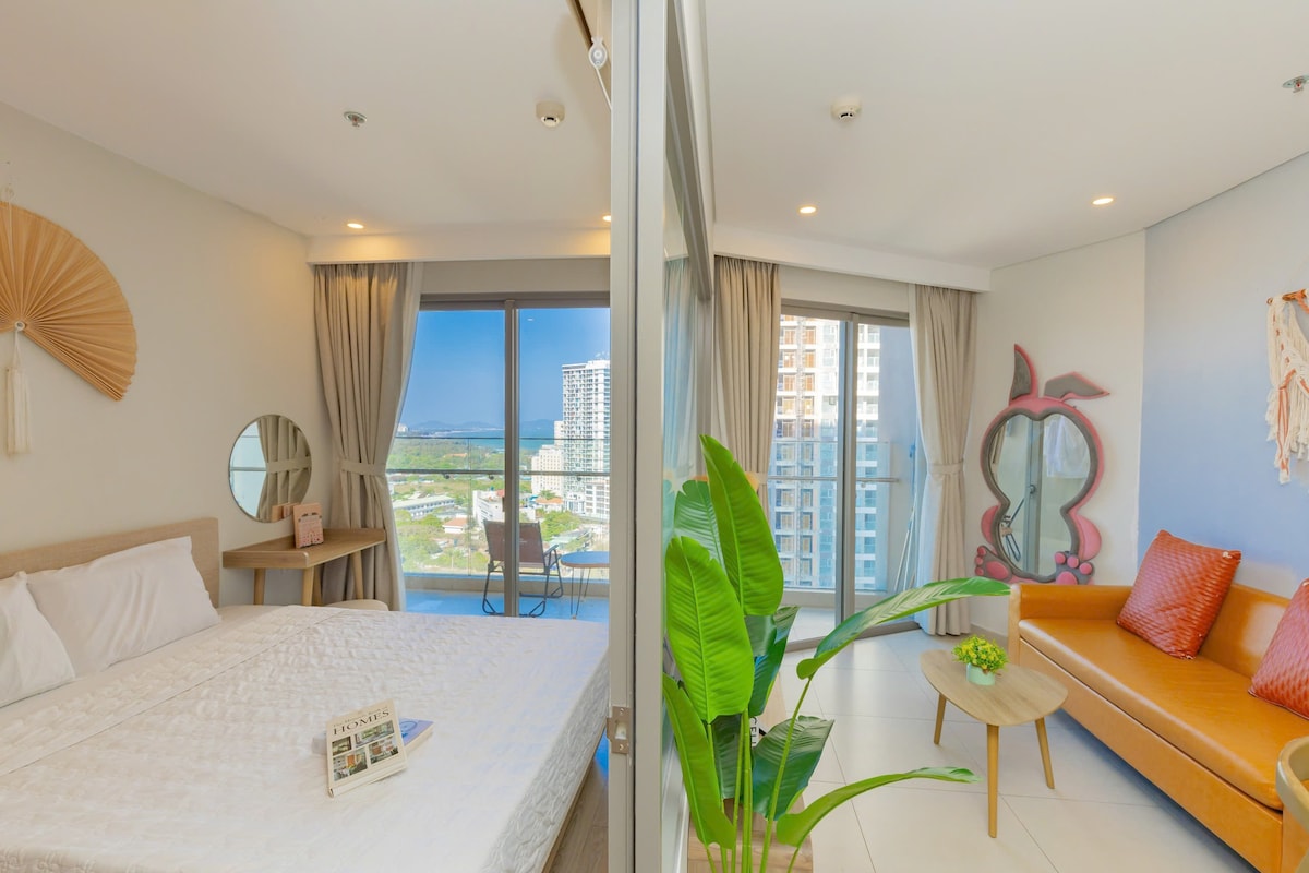Bem-vindo ao TheView at CSJ Tower! Nosso apartamento de praia totalmente equipado perto de Lotte Mart e GS25 é perfeito para um casal, famílias ou pequenos grupos de 2 a 3 amigos. Com um quarto e um sofá-cama, oferece conforto e aconchego. Relaxe e aproveite seu tempo com a família e os amigos. O TheView é o lugar perfeito para uma viagem relaxante.