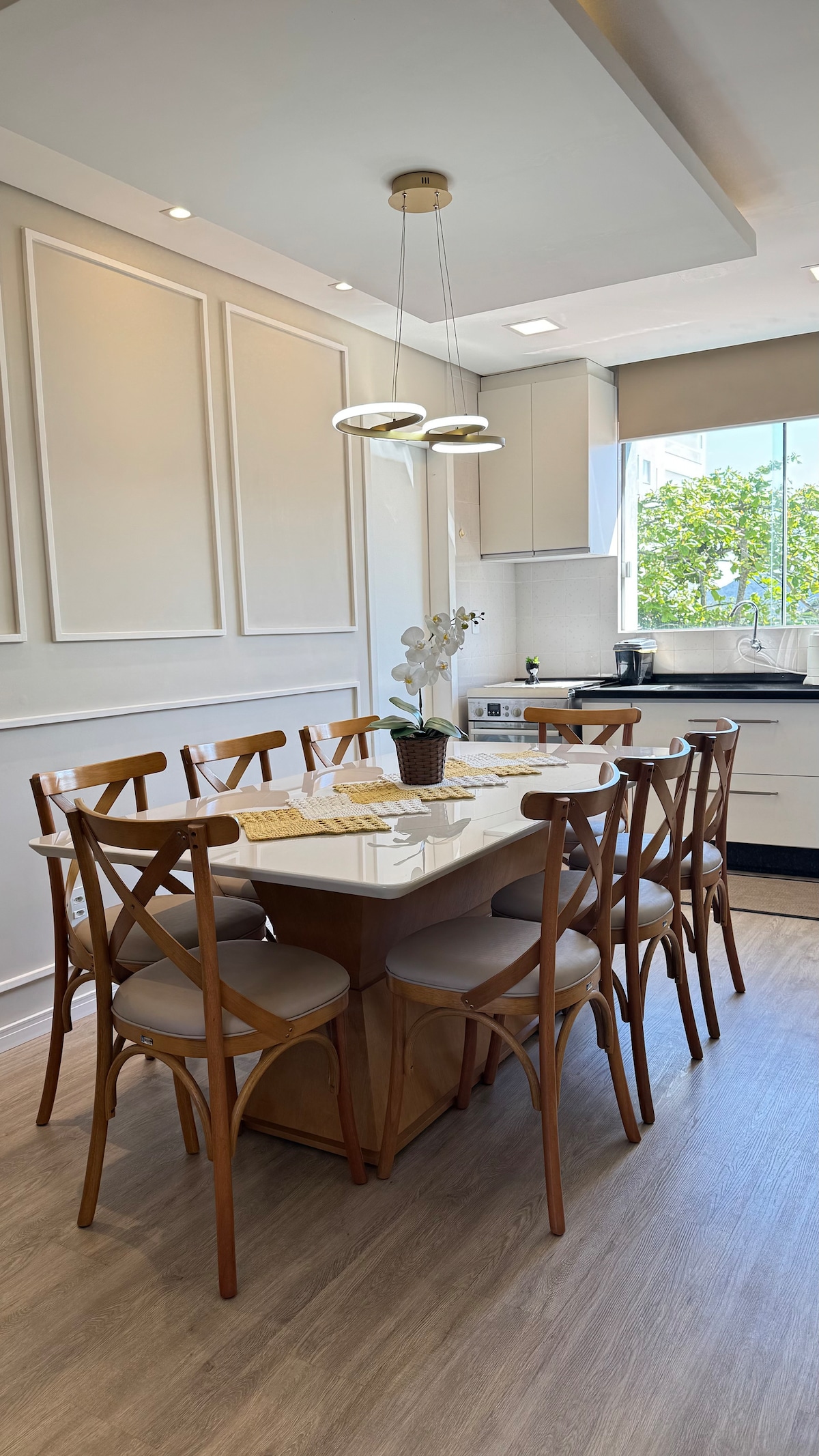 Lindo apto finamente mobiliado, totalmente climatizado. Possui 75m² com varanda fechada e vista lateral mar. Suíte com cama queen mais um dormitório com cama de casal, ambos com Smart TV. Cozinha, sala e sacada com churrasqueira integrados em conceito aberto. A cozinha é equipada com móveis planejados, fogão, forno elétrico, geladeira e microondas, além dos demais utensílios. Lavanderia com lavadora e secadora à disposição.