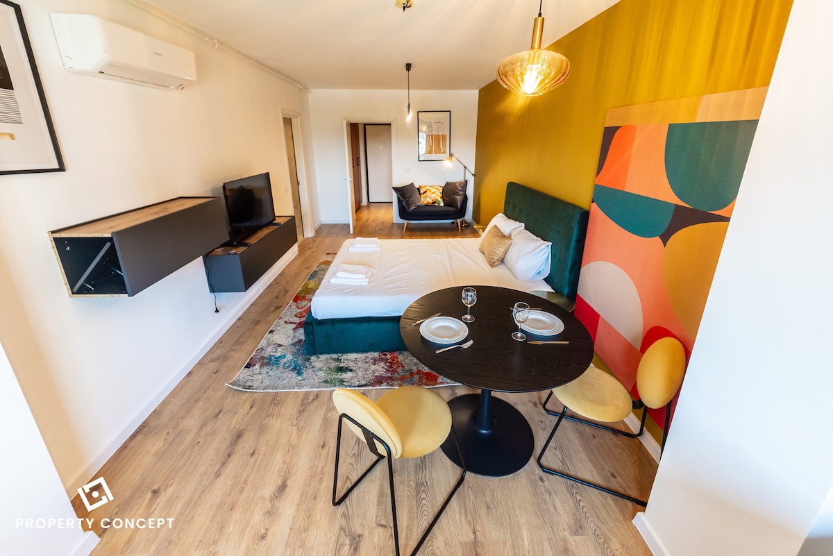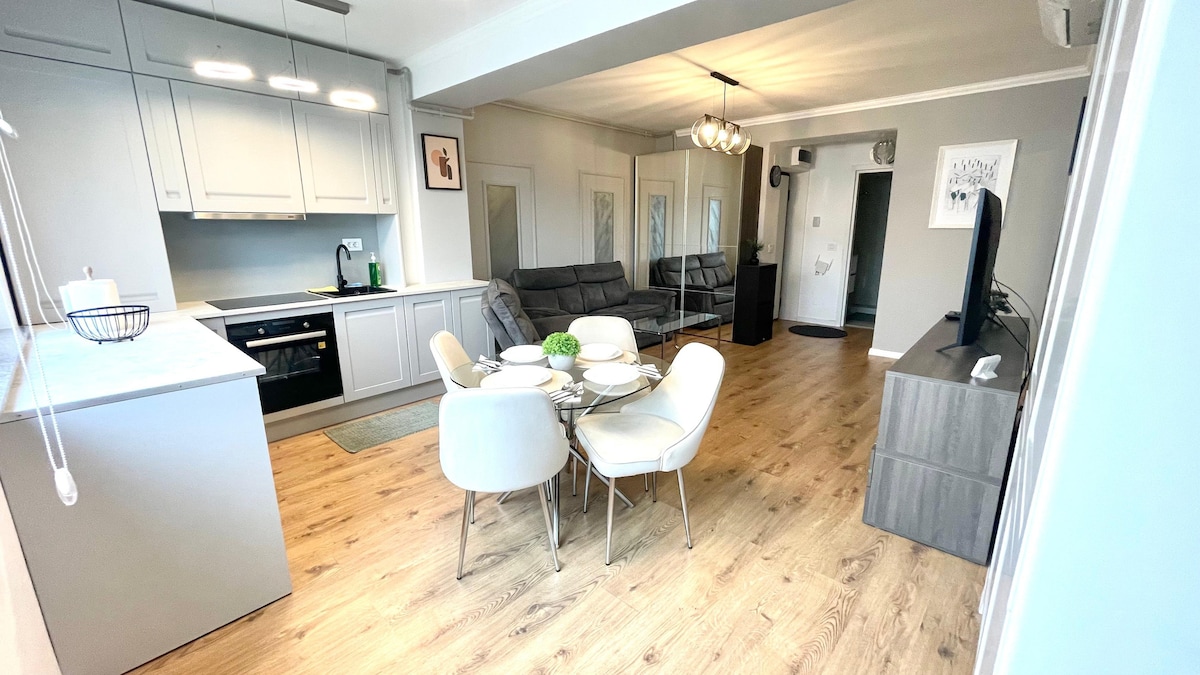 Fique em um apartamento de 1 quarto lindamente projetado, localizado no prestigiado complexo One North, perfeito para casais, viajantes de negócios que visitam Bucareste. Profissionalmente decorado por um designer de interiores, o espaço oferece uma estética moderna e refinada e uma atmosfera aconchegante e acolhedora. Desfrute de uma confortável cama king-size, uma cozinha totalmente equipada, Wi-Fi e um espaço de trabalho exclusivo perfeito para trabalho remoto. Localizado em um edifício seguro, você está a uma curta caminhada dos principais edifícios de escritórios, cafés.