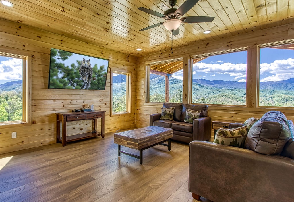 Experience unparalleled luxury at Windows to the Mountains, a modern marvel nestled in Gatlinburg with stunning views of Mt. Leconte. Chalet features a rooftop deck with a modpool, movie theater, and exquisite outdoor amenities. Enjoy a fully-equipped kitchen, cozy living room with a vapor fireplace, and a master suite with a spa-like bathroom. Complete with a coffee bar, game tables, and a sauna, Windows to the Mountains offers an exclusive retreat for discerning guests seeking a lavish escape.