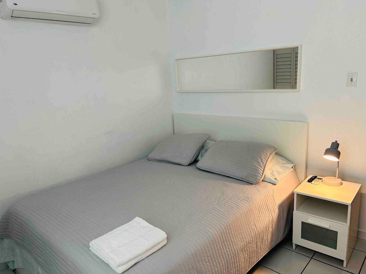 Apartamento totalmente equipado, ar condicionado, tv, banheiro, água quente, sabão, wi-fi, fogão, geladeira, microondas.