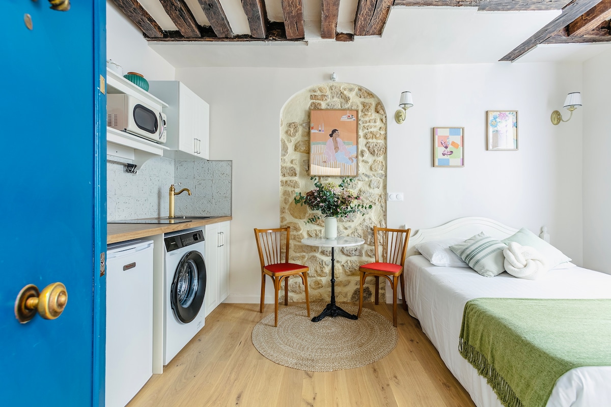 Place des Vosges no coração do bairro parisiense de Marais: Lindo apartamento de 2 quartos decorado com cuidado em uma área tranquila. 1 quarto (cama de 160 x 200), uma sala de estar com um sofá-cama confortável com um colchão de verdade, uma cozinha equipada, 1 banheiro com chuveiro e um vaso sanitário. Ar condicionado móvel! Perfeito para 3 adultos OU 2 adultos e uma criança/bebê Possibilidade de deixar a bagagem a partir das 12h30 enquanto a empregada limpa e retorna a partir das 15h para o check-in.