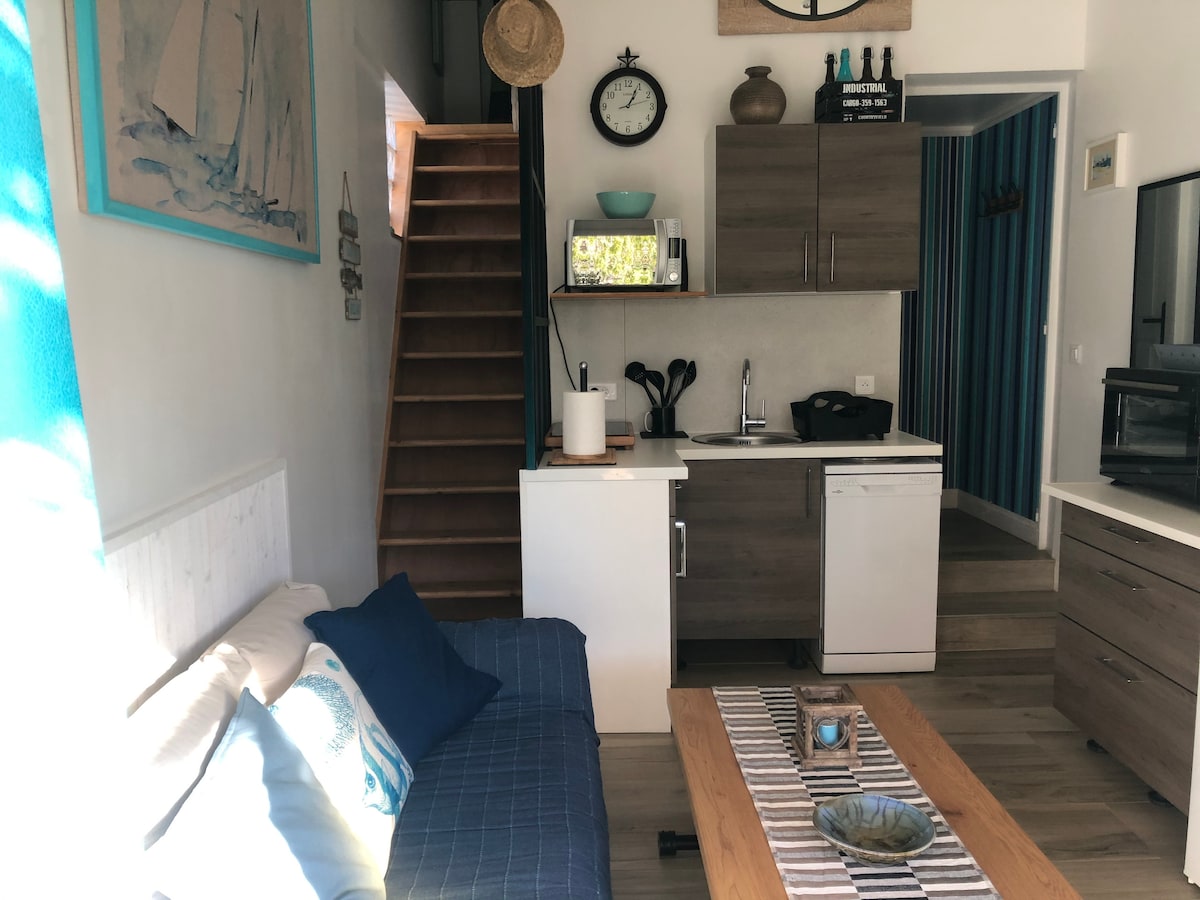 Estúdio novo e confortável com terraço e vista para o mar e o porto. Muito iluminado, cama Queen-Size, ar-condicionado reversível, TV conectada de tela plana, internet, banheiro com chuveiro italiano, cozinha mobiliada e equipada, máquina de lavar, varanda/terraço com móveis de jardim... Localizado no 1º andar com elevador em residência segura. Grande estacionamento público gratuito a 50 m. Praia a 300 m Todas as lojas e serviços acessíveis a pé (restaurantes, bares, padarias, supermercados, médicos, farmácia...)