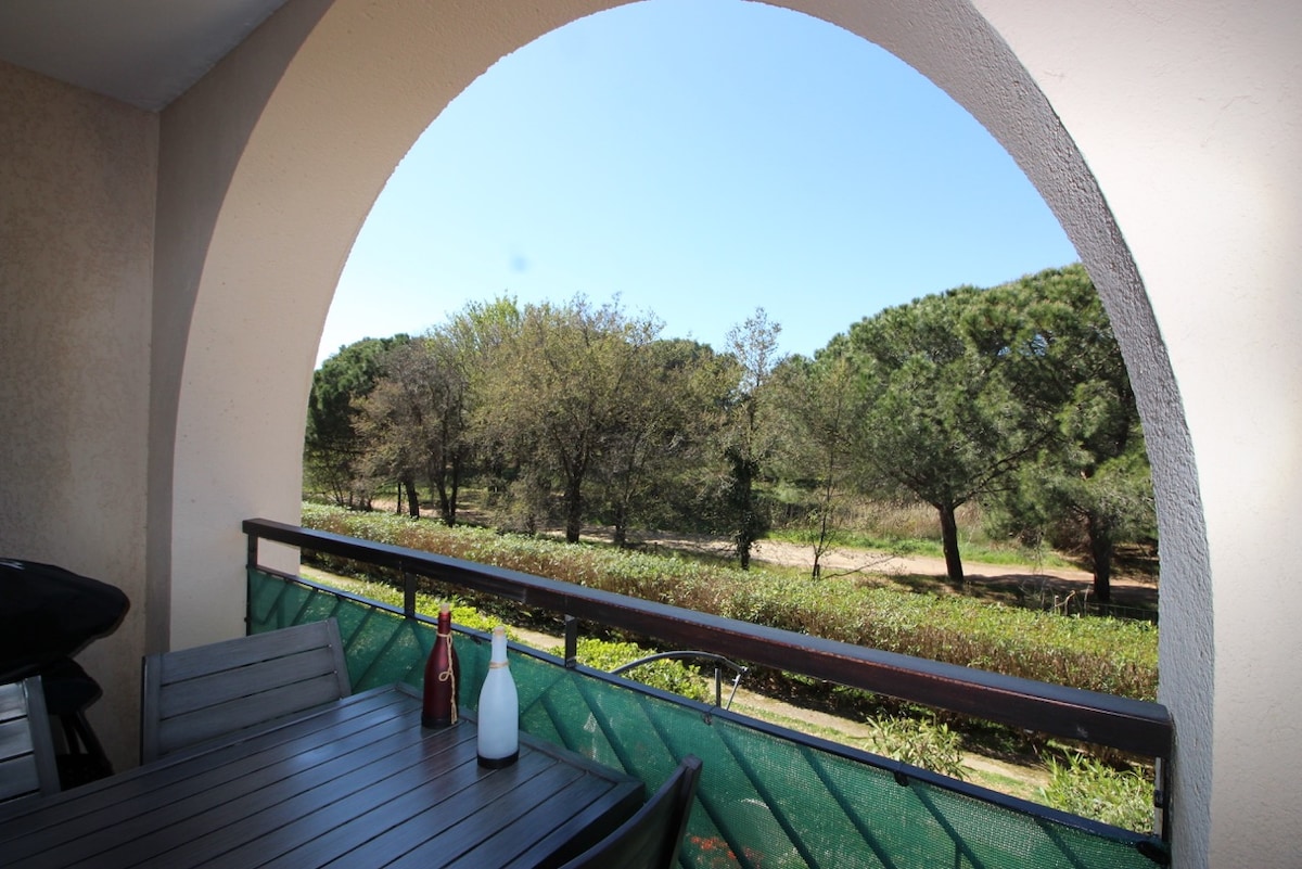 T2 com jardim, ar condicionado, piscina e estacionamento – Giens