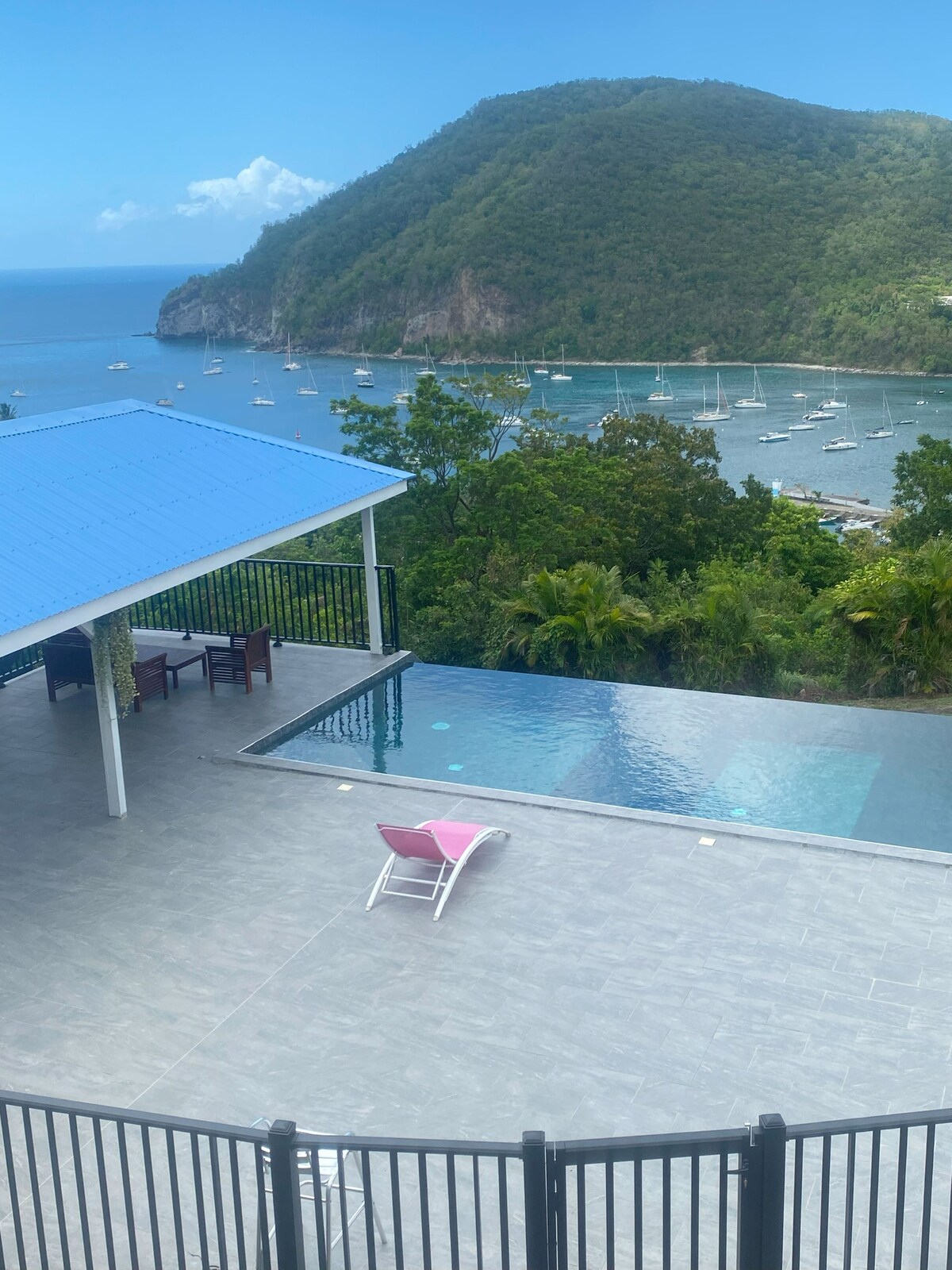 Encantador bangalô decorado com bom gosto, localizado entre o mar e as montanhas, oferecendo uma vista excepcional sobre as ilhas de Saintes e Marie-Galante a partir de um magnífico terraço de madeira com jacuzzi. Você poderá apreciar o mar até onde os olhos podem ver e desfrutar do conforto de cada um dos quartos abertos para o exterior. Uma localização perfeita para acessar as cataratas de Carbet a 10 minutos, a estação marítima para as ilhas Saintes a 7 minutos, as praias de areia preta a 3 minutos, a Soufrière a 25 minutos. Ideal para famílias, amigos...