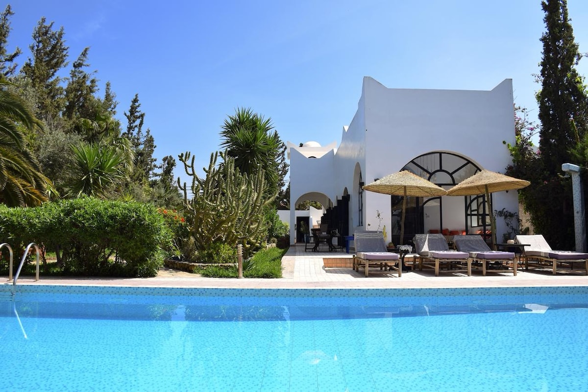 Charming Family Villa, 2levels, independente, espaçoso, bem iluminado, uma grande piscina privada de 75m² e um belo jardim. Localizado no campo, a 16 km de Essaouira na rua Sidi Kaouki, tem um acabamento luxuoso, chaminé, lareira aberta no jardim, oliveiras e árvores frutíferas e dois belos terraços com pérgulas. Moderno e tranquilo. Aeroporto a 6,5 km e lojas e um supermercado a 10 minutos. Você precisará de um veículo para locomoção.