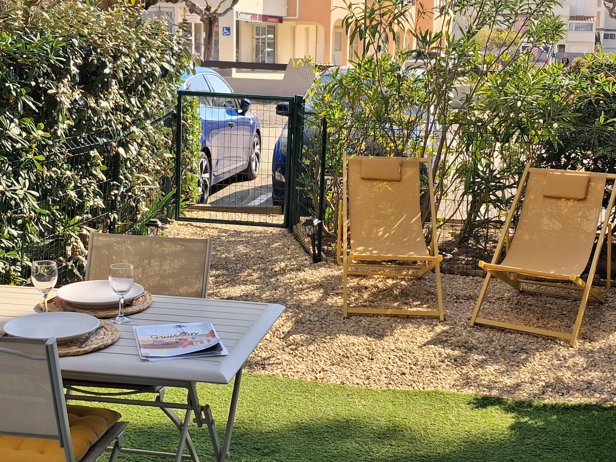 Linda casa totalmente remodelada com ar condicionado de 1 estrela com uma superfície de 26 m2 Está localizado a 20 m da praia de Le Grazel e tem um terraço ao ar livre com mesa e cadeiras e espreguiçadeira. Acesso direto à praia pelo portão da residência. Espaço de estacionamento na residência. Tudo fica a uma curta distância a pé de restaurantes, portos, lojas e a 5 minutos do Balneo, Pirate Parc... Cachorro aceito.