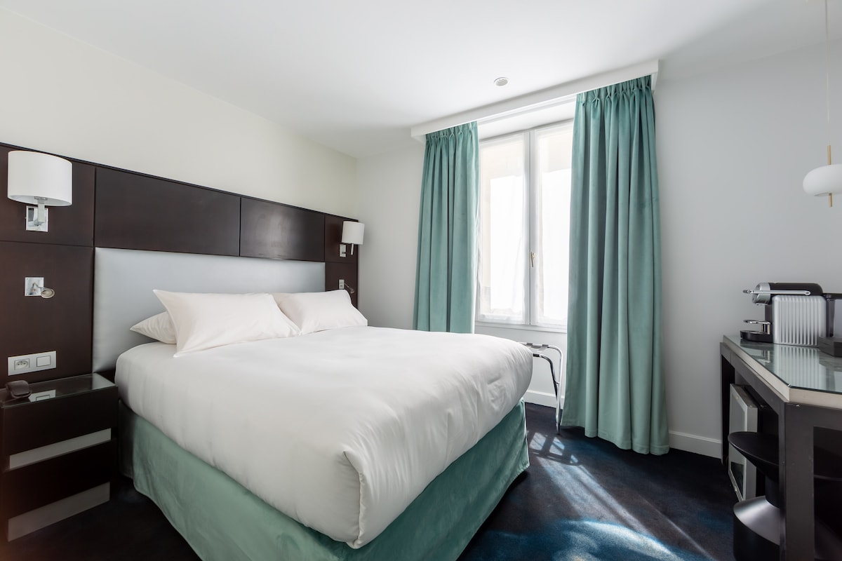 The superior rooms feature a large comfortable bed, natural wood floors, and elegant touches like a desk, bedside lamps, and a spacious closet. Enjoy modern comforts with a minibar, courtesy tray with kettle, flat screen TV, WiFi, air conditioning, and an individual safe. Thoughtful details like reading lights, shelves, and a telephone make your stay convenient and relaxing. This inviting space blends style and practicality for a memorable Paris visit.