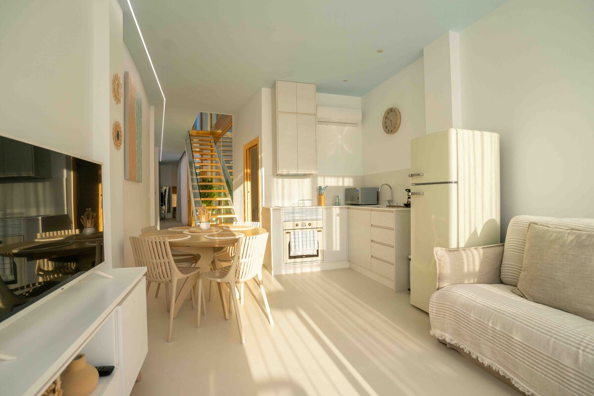 Duplex de 90m² oferece um ambiente espaçoso com três quartos, proporcionando acomodação para até 6 pessoas. A área de jantar se torna um espaço familiar. O espaçoso terraço permite que você aproveite o clima mediterrâneo e as vistas para os arredores. Tem dois banheiros e um chuveiro em cada um deles. Também com uma cozinha totalmente equipada para que você possa preparar refeições deliciosas com ingredientes locais e se sentir em casa durante sua estadia.