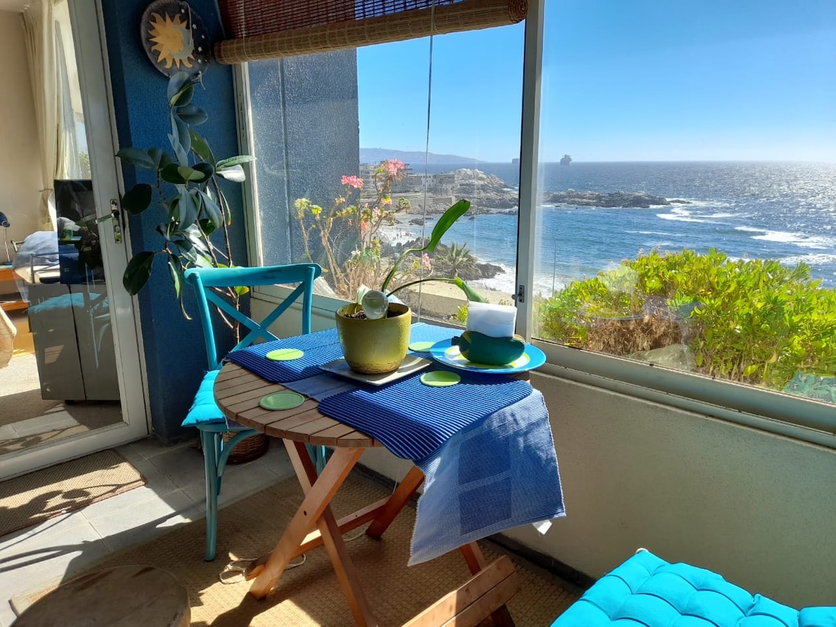 Apartamento agradável e acolhedor de frente para o mar, localizado na primeira linha de Reñaca, totalmente equipado para 2 pessoas, tem tudo o que você precisa para sua estadia, estacionamento privativo e seguro, quarto com banheiro, sala de estar com futon, terraço de frente para o mar, Wifi, TV a cabo, grelha elétrica, binóculos, bar de restaurante exclusivo, excelente edifício, bom custo-benefício. Apartamento ideal para teletrabalho e relaxamento em frente ao mar, boa conexão Wi-Fi. Tem uma piscina aquecida, jacuzzi, bar, tudo o que você precisa em um só lugar!
