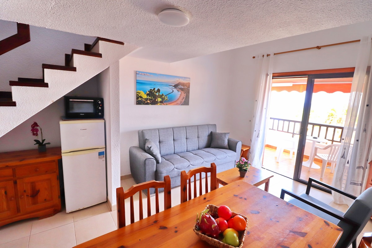 Bem-vindo ao nosso estúdio totalmente reformado com uma vista impressionante para o mar, perto de belas praias e pontos de surfe. Equipado com Wi-Fi rápido, TV smart, cozinha totalmente abastecida, chuveiro maravilhoso, máquina de lavar roupa e todos os confortos. Os hóspedes têm acesso gratuito à piscina. A estação de ônibus e táxi fica bem em frente ao estúdio. Há supermercados e lojas em frente ao estúdio. A apenas 5 minutos a pé da Playa de las Américas, a 8 da Playa de Troya. A 15 km do aeroporto.