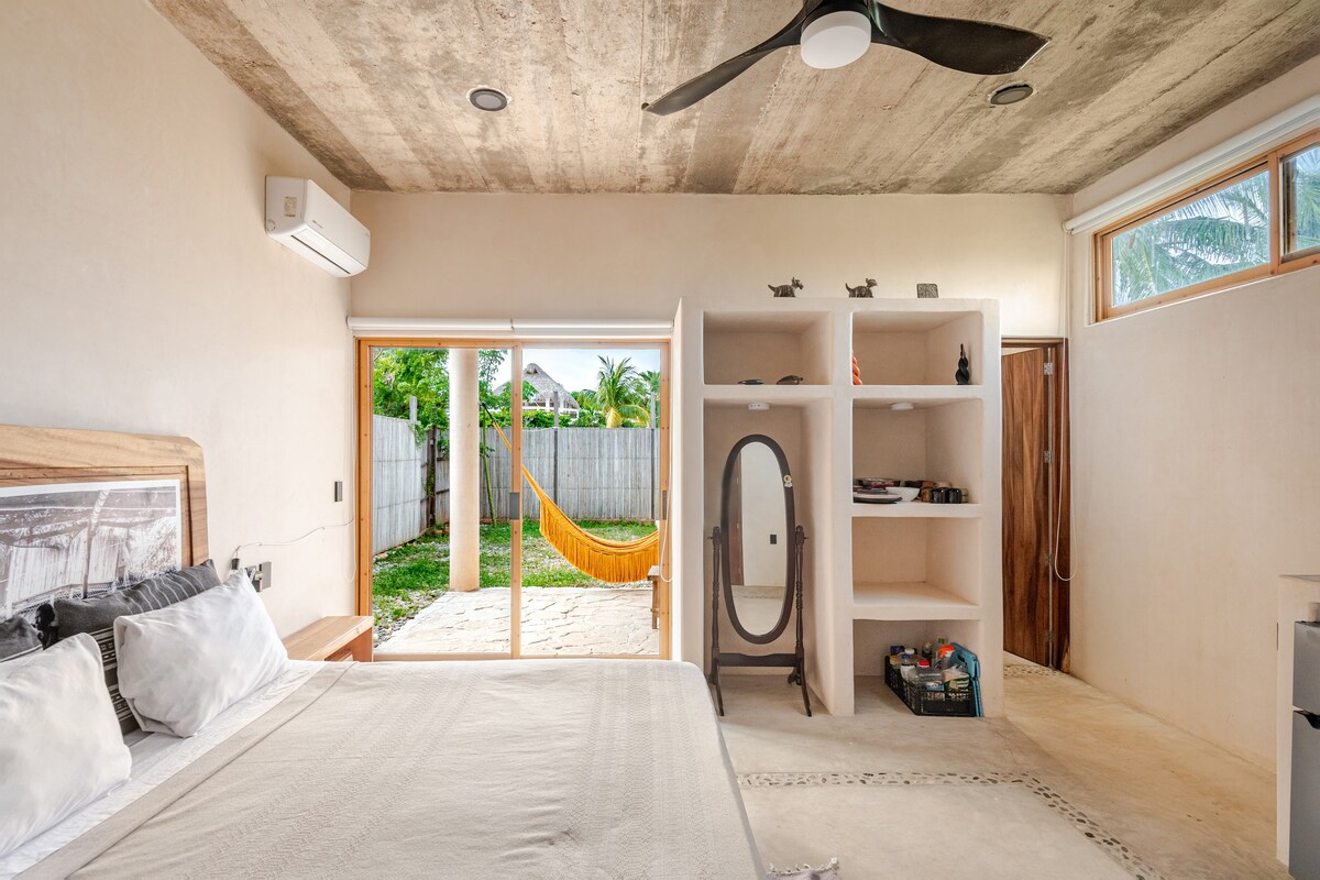 Suíte bonita e espaçosa com cama king size, TV giratória de 50", ar condicionado, cozinha, banheiro e piscina privativa. Sinta a tranquilidade, relaxe no redemoinho da sua piscina privativa e desfrute do conforto de ter tudo o que você precisa para uma estadia agradável. Estamos em Punta Zicatela, a 7 minutos a pé da praia, o principal local de surf, restaurantes, bares e área de compras. Perto de tudo, mas longe da agitação da festa. Temos Internet Starlink