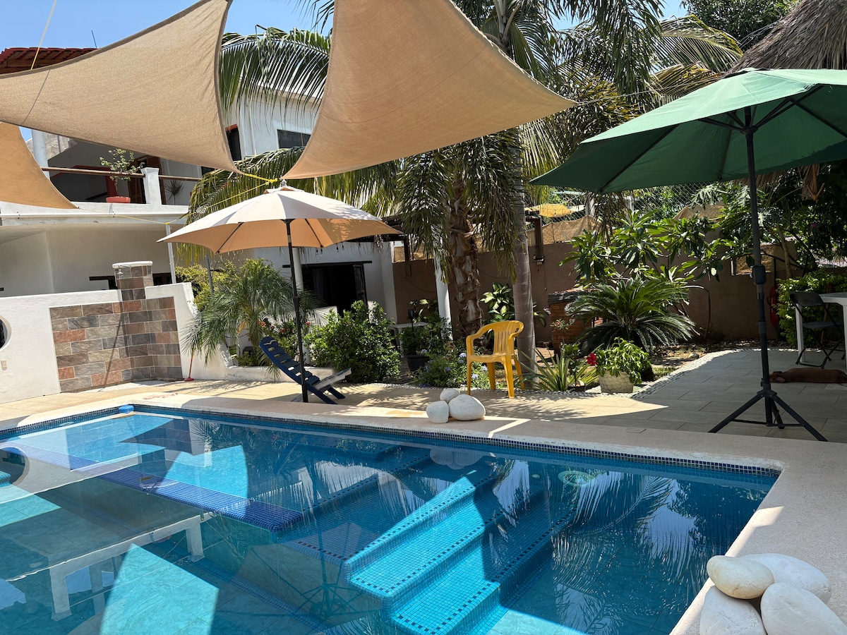 Discover Tranquility in our spacious suite with 2 queen beds on the 1st floor. Enjoy high-quality sheets on cozy beds, private bathroom, mini fridge & AC. Step onto your patio with hammock, embracing pool views. Just a 5-min walk to Playa Zicatela and right by the new market. -2 queen beds, premium sheets -Private bathroom -Refreshing pool & outdoor furniture -Mini fridge -AC, WiFi, TV -Spacious closet & work desk -Relaxing patio with hammock -Embrace local parota wood elegance